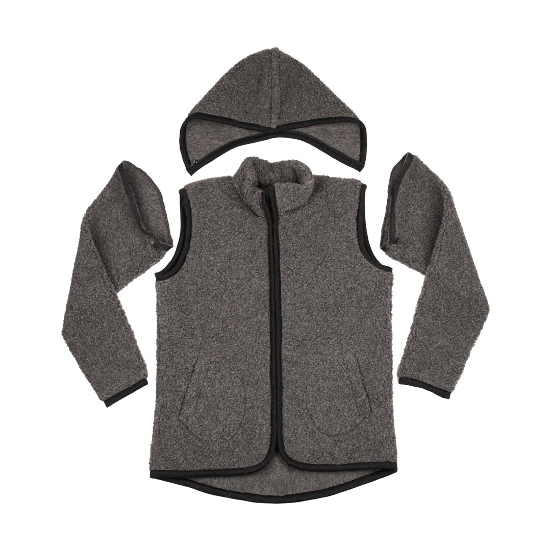 This stylish hooded jacket is really classy and will catch the eye of even the most particular customers. Its 2in1 style offers countless opportunities for wearing. On colder days, you can wear it as a top and keep the hood up to keep really warm, or you can remove the hood and sleeves and wear it as a stylish vest. This trendy jacket with a detachable hood and sleeves is made of high quality sheep’s wool, has two practical pockets on the sides and an easy zip fastening.