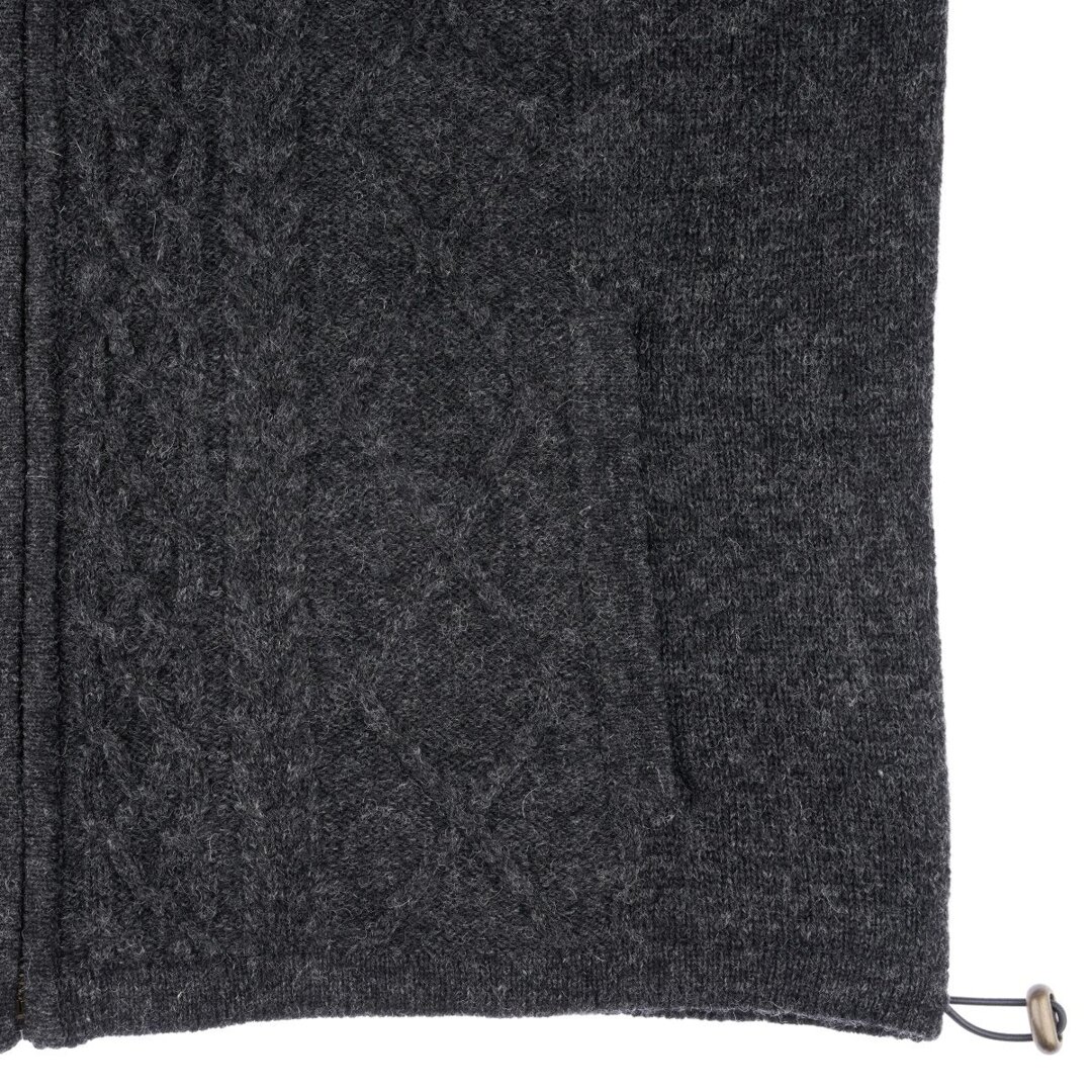 This sweater has a zipper, two pockets, and can be tightened at the bottom edge. It also has a cotton lining and a soft fleece lining on the collar.