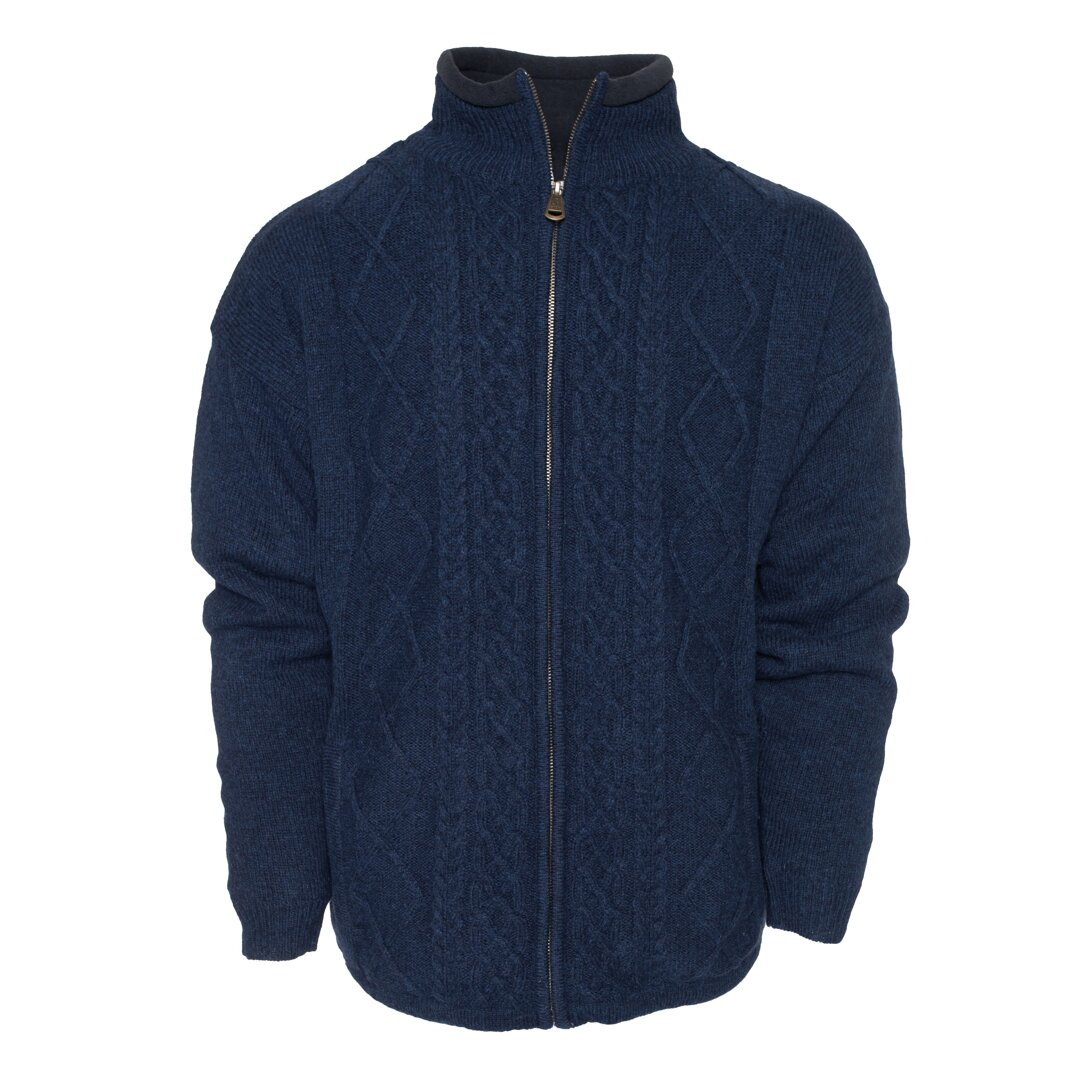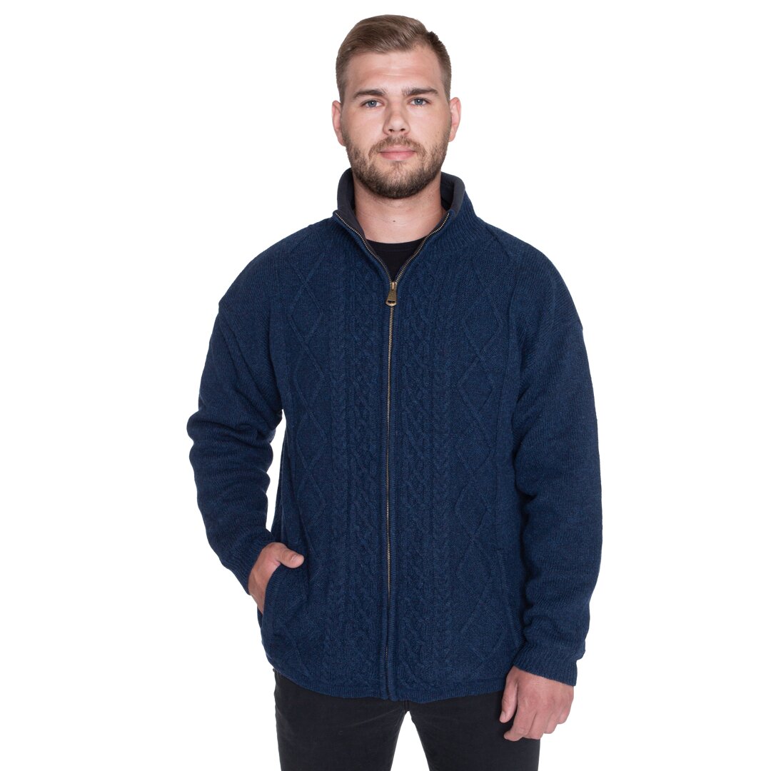 This sweater has a zipper, two pockets, and can be tightened at the bottom edge. It also has a cotton lining and a soft fleece lining on the collar.
