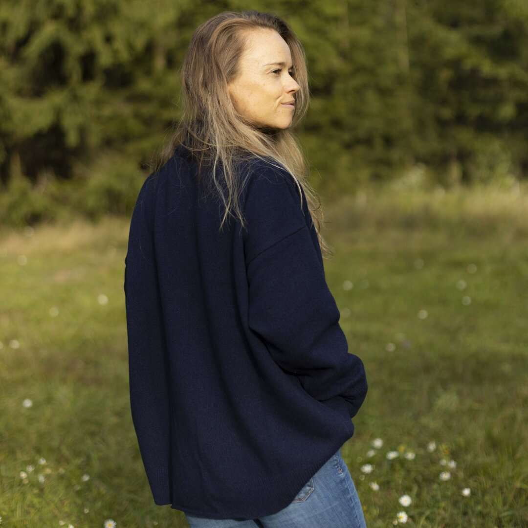 The wool used to make this sweater is very soft and has been carefully worsted, so it feels really velvety and you don’t have to worry about itchiness we used to associate with sweaters. In the case of this model, the wool yarn is also enriched with fine cashmere, which makes the sweater even softer.