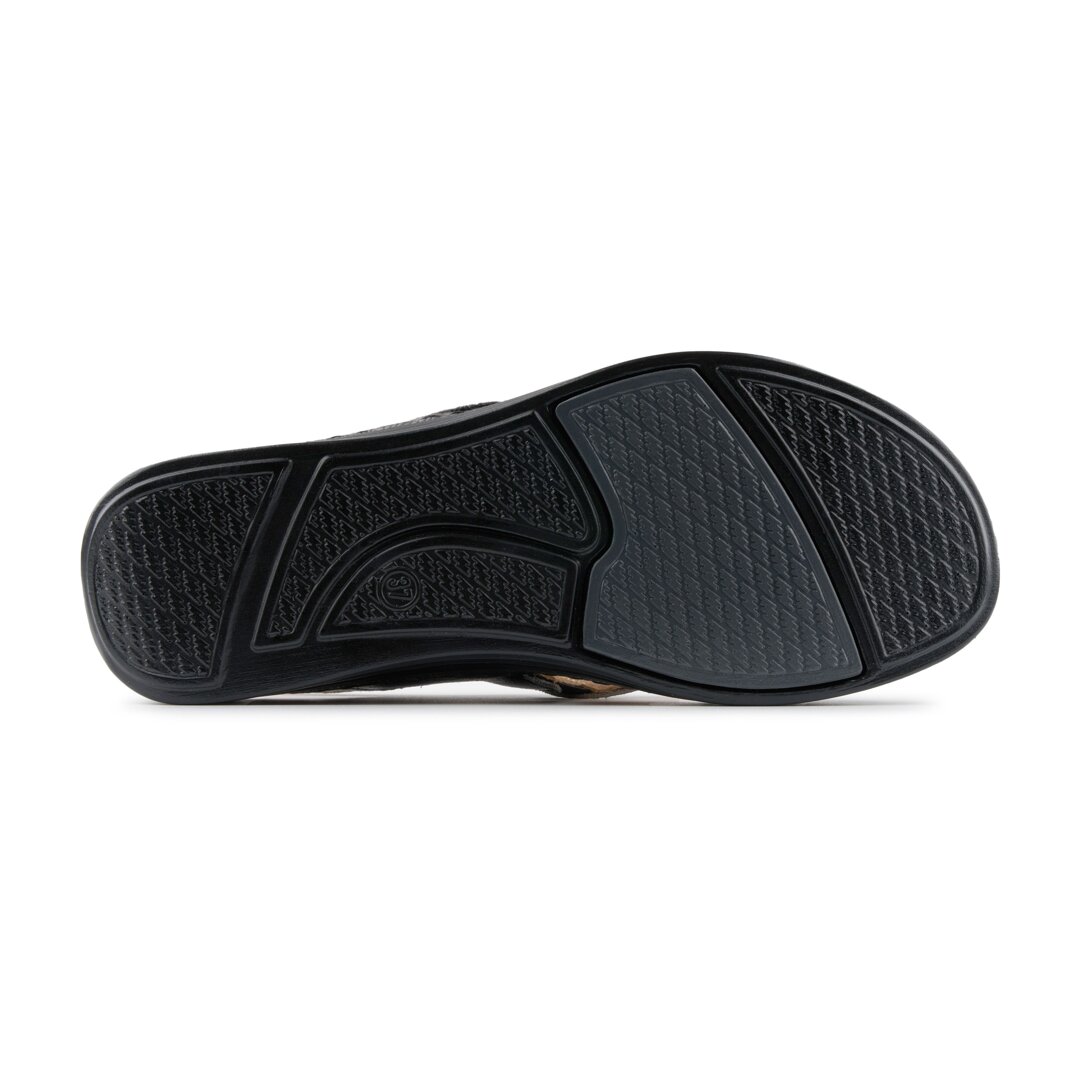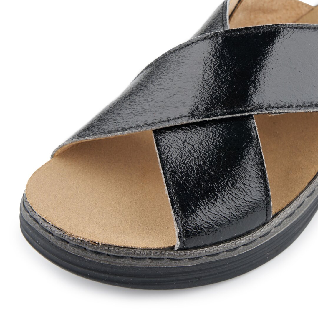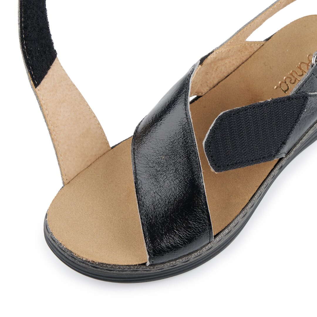 The strap around the heel is velcro, as is one of the straps across the instep. The other one is elasticated, so the sandals can be easily adjusted to fit each foot and you can change the fit as needed during the day. This is very helpful during summer, especially when out walking, as your feet can get swollen. The insole is removable, making the shoes easy to care for. The heel is slightly raised.