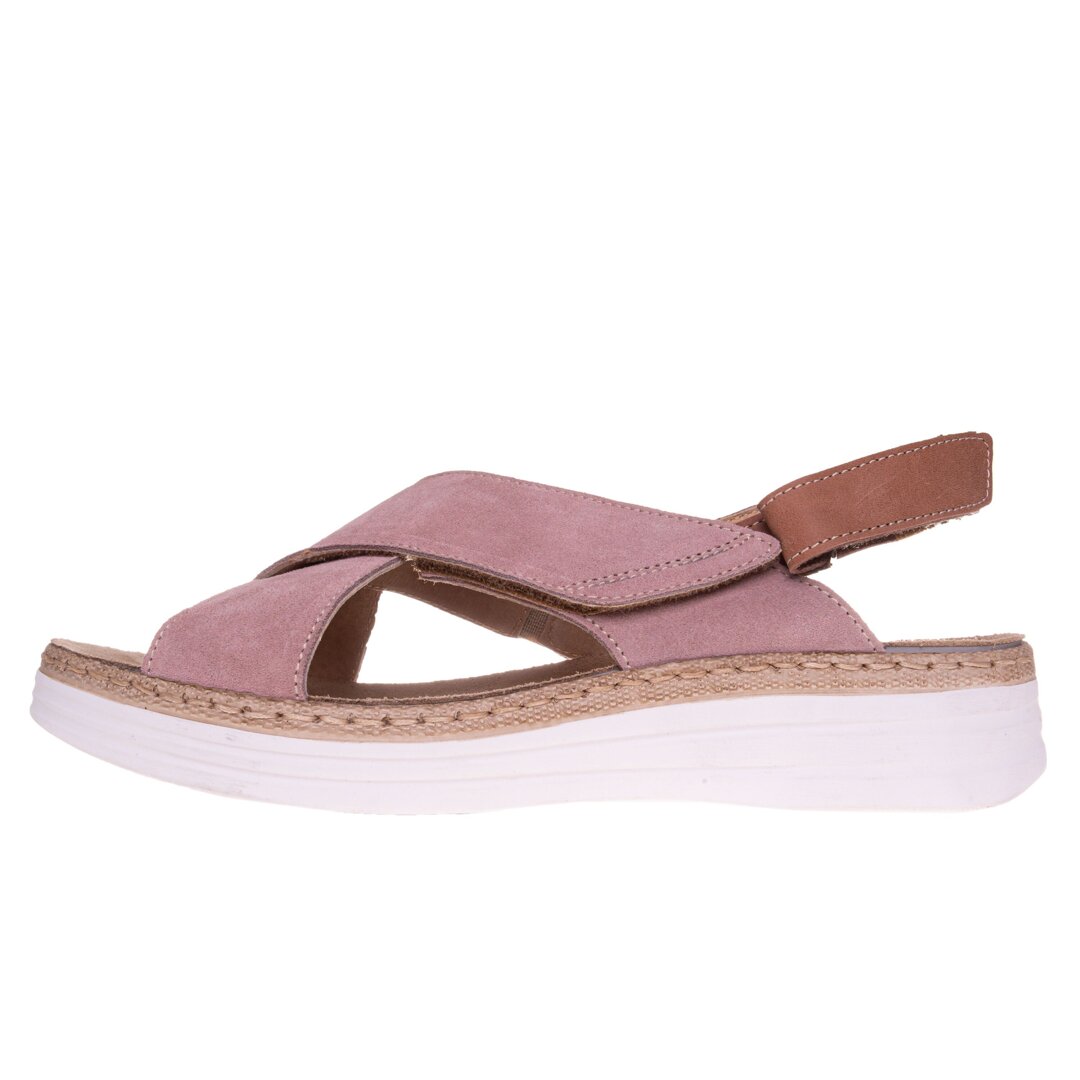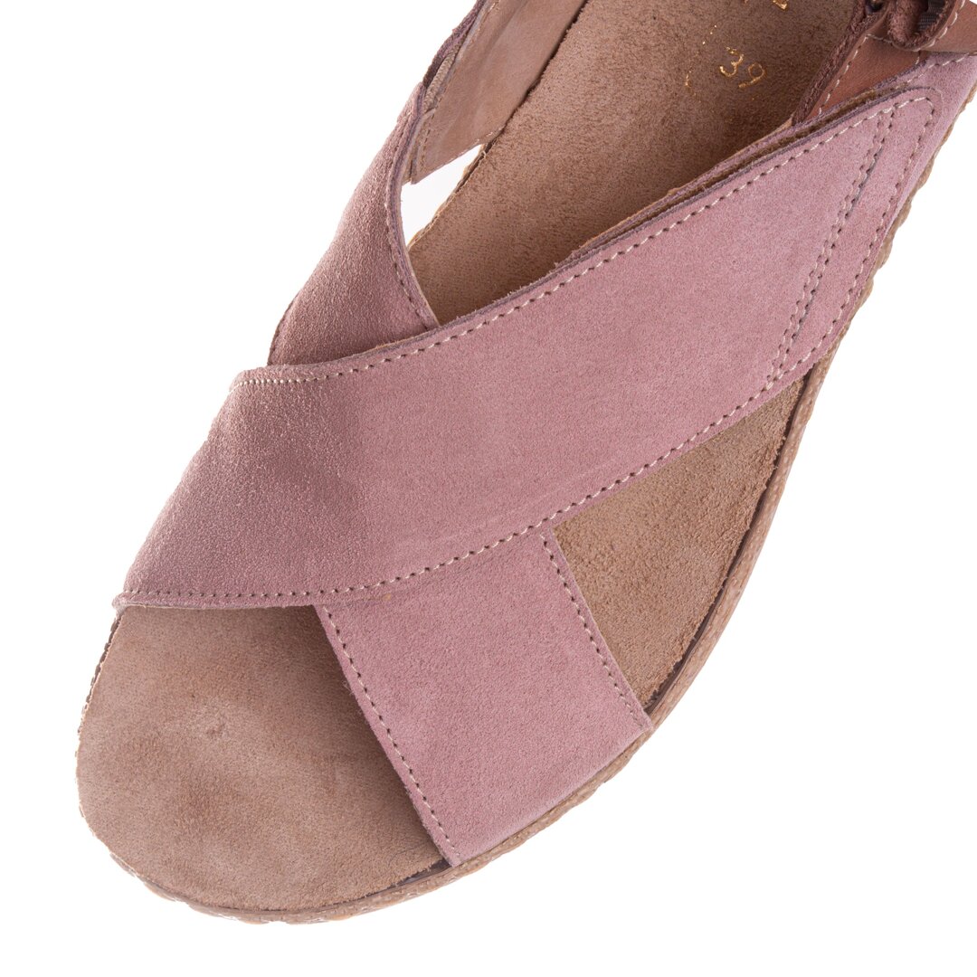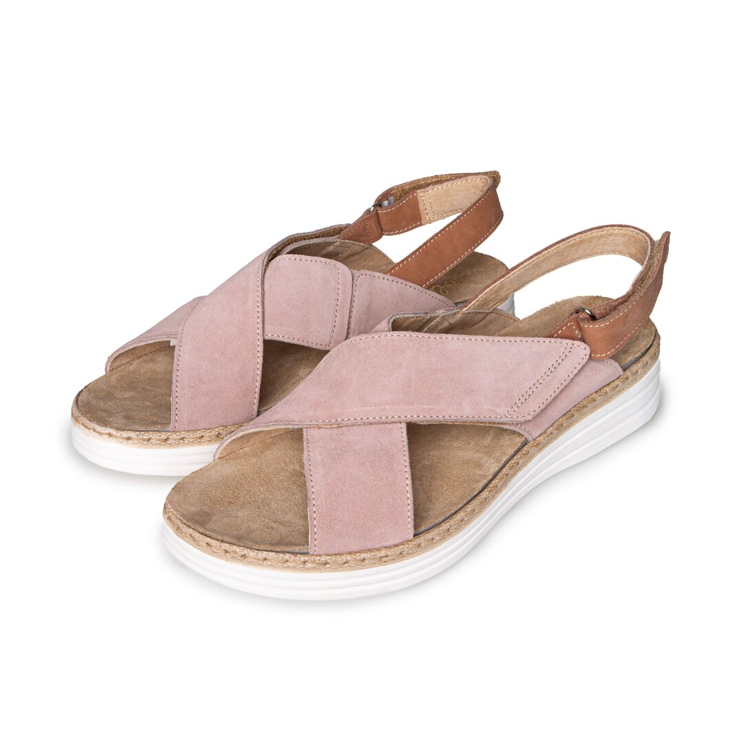 The strap around the heel is velcro, as is one of the straps across the instep. The other one is elasticated, so the sandals can be easily adjusted to fit each foot and you can change the fit as needed during the day. This is very helpful during summer, especially when out walking, as your feet can get swollen. The insole is removable, making the shoes easy to care for. The heel is slightly raised.