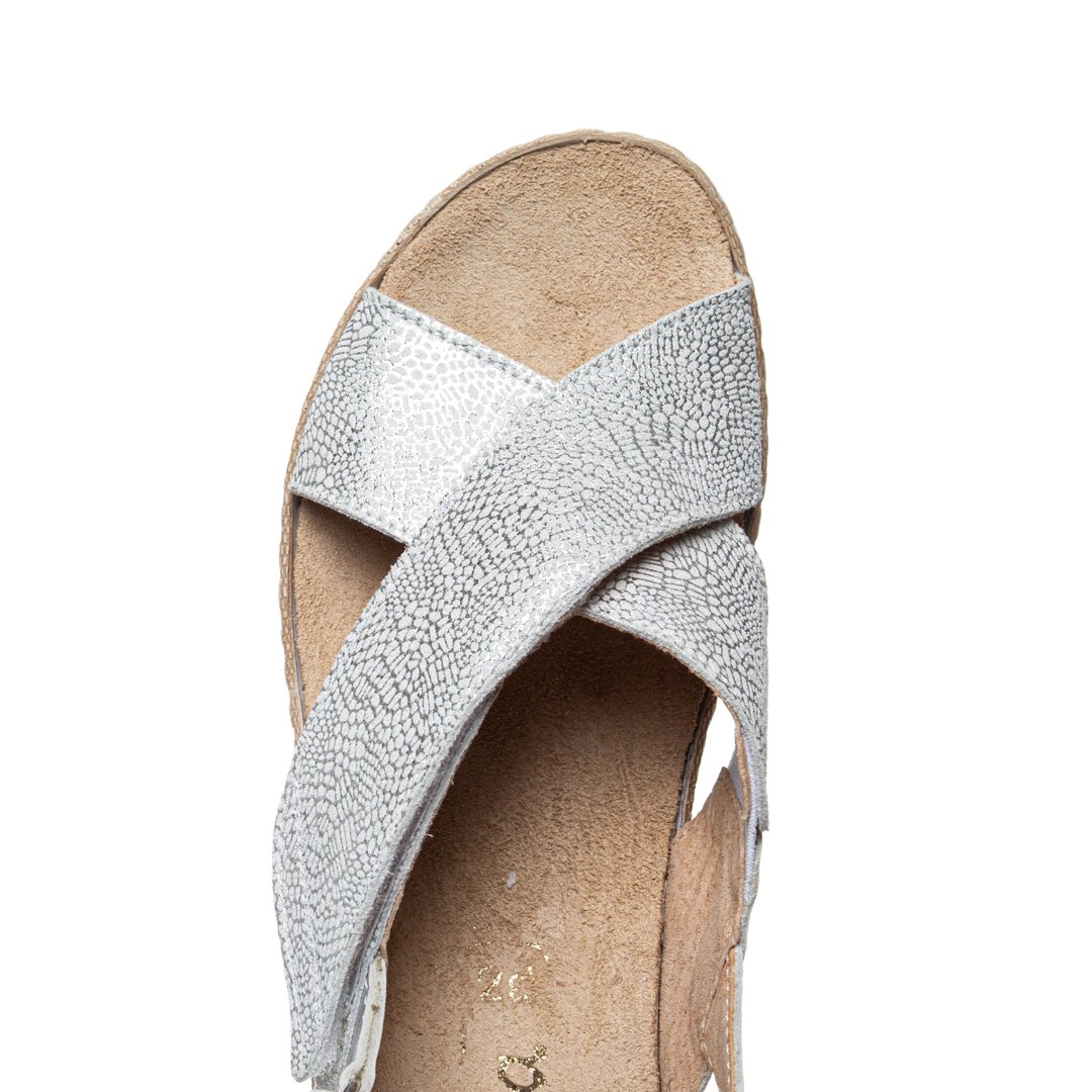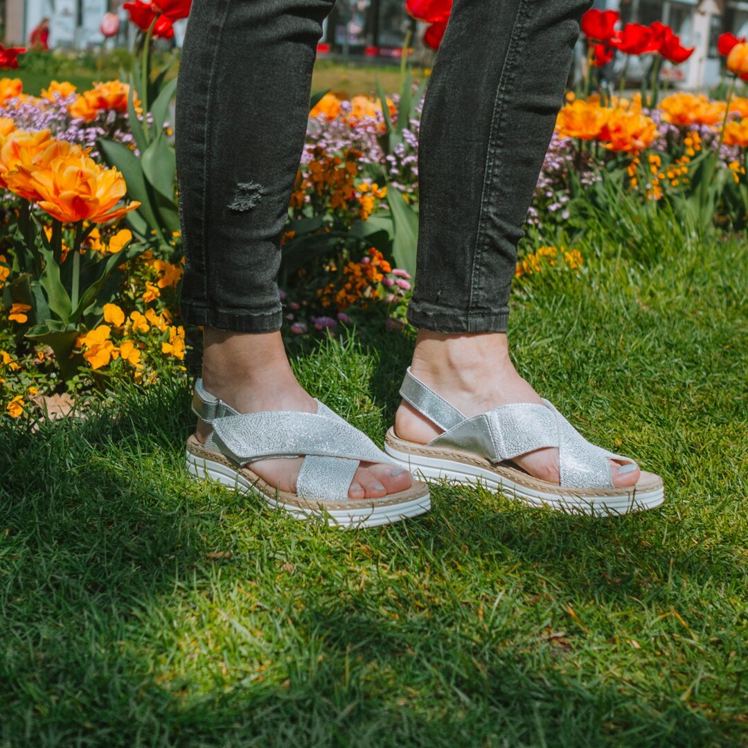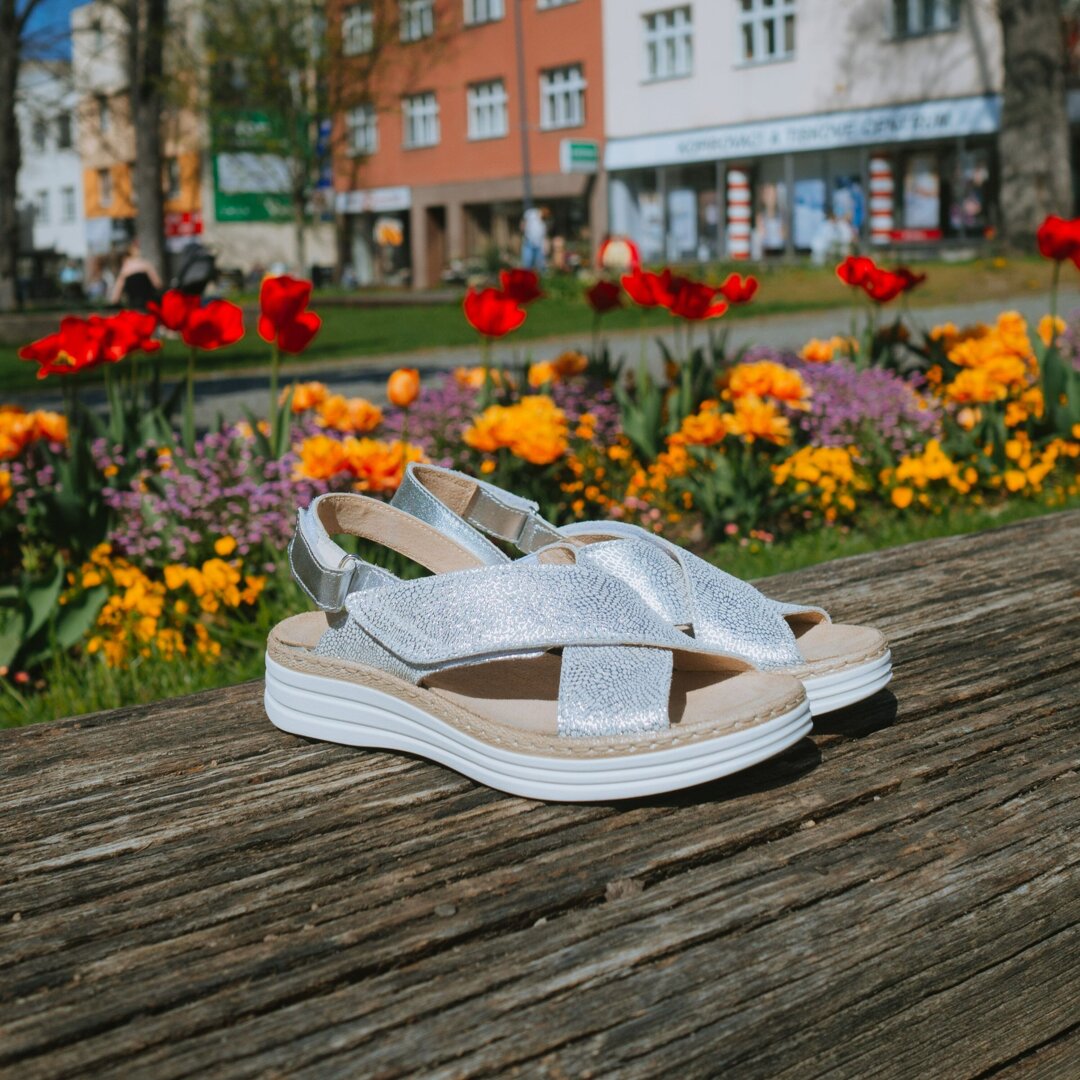 The strap around the heel is velcro, as is one of the straps across the instep. The other one is elasticated, so the sandals can be easily adjusted to fit each foot and you can change the fit as needed during the day. This is very helpful during summer, especially when out walking, as your feet can get swollen. The insole is removable, making the shoes easy to care for. The heel is slightly raised.
