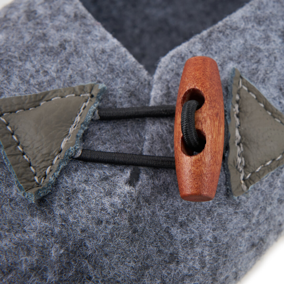 Felt slippers are slip-on, so they're easy to quickly put on. Thanks to the wide cut, they provide plenty of space for the foot, so no rubbing or squeezing anywhere. Thanks to the elastic band in the instep area, the slippers are easy to put on. The wooden ornament also serves as a decorative element.