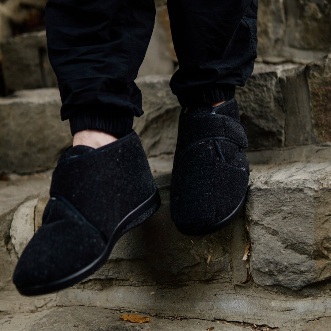 Our men’s slipper boots with velcro fastening are sturdy, durable, and thanks to Merino wool, beautifully warm too. They are also very soft and have a closed heel, so they stay firmly on the foot and provide insulation from cold floors. Another advantage of these warm shoes is the non-slip sole, which means that they are considered to be safe for the elderly. It is entirely up to you whether you wear them indoors or outdoors, thanks to the sole, they are suitable for both.
