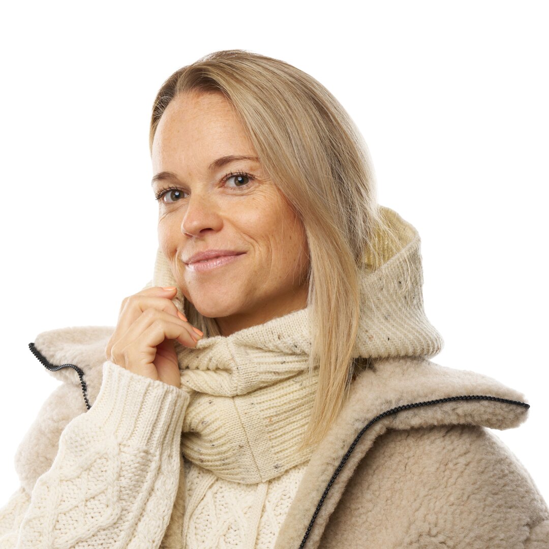 The thoughtful combination of neck warmer and hood combines head and neck protection from the cold into one fluffy piece made of Merino wool. You can use the neck warmer instead of a scarf, and when the weather cools, just pull up the hood and your head will be warm too.