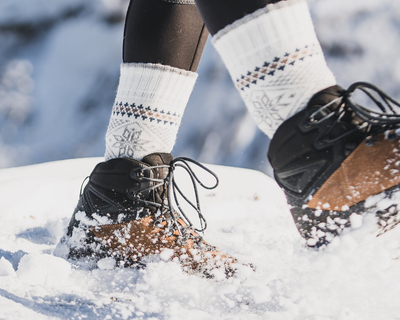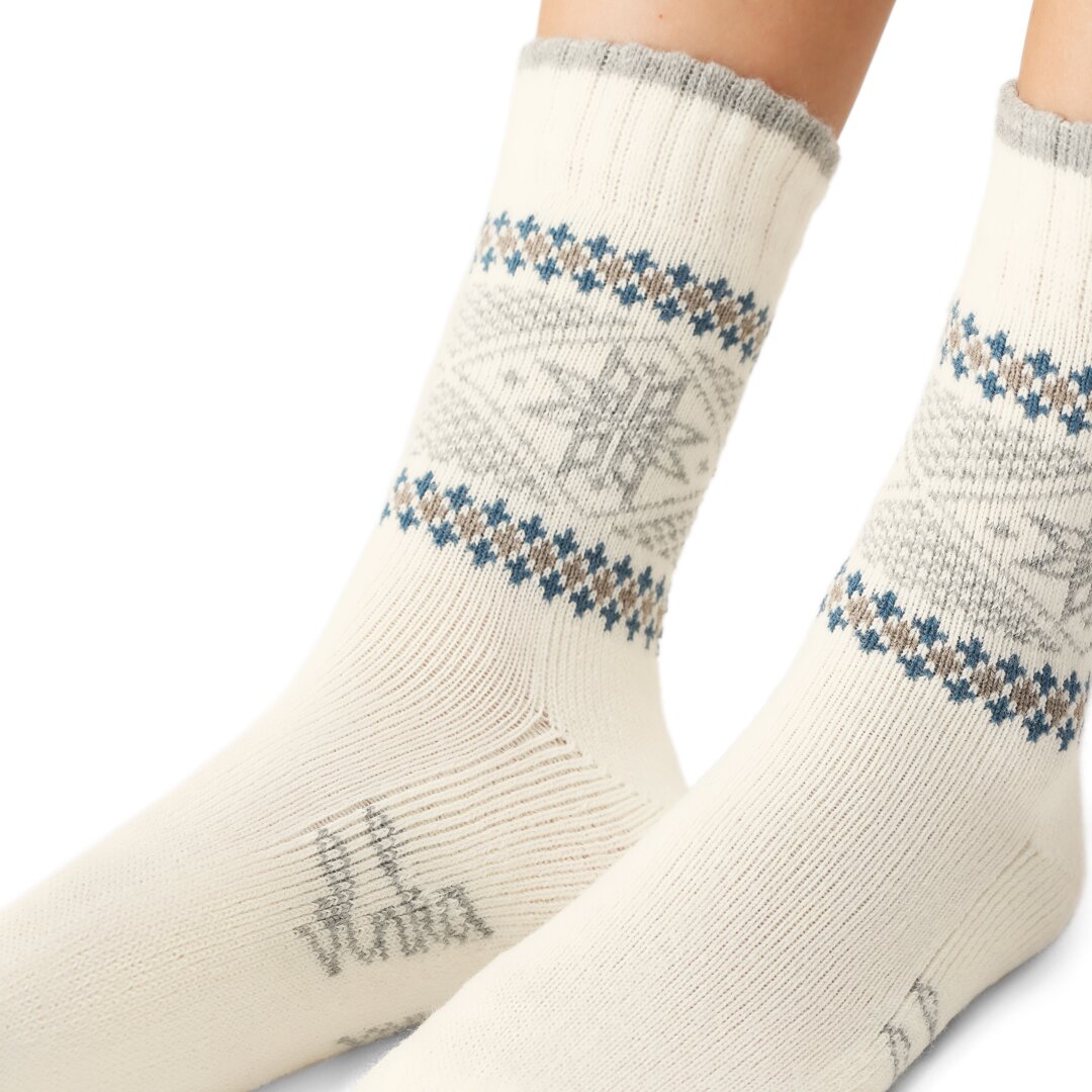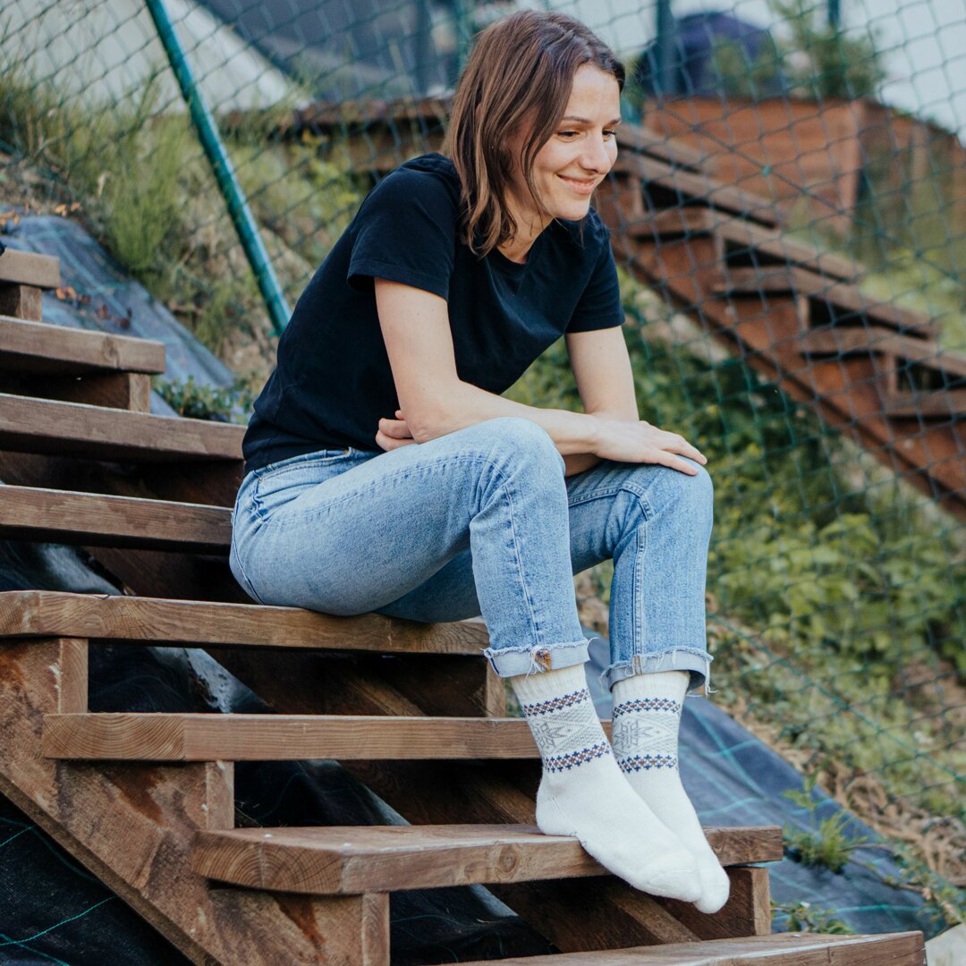 These Merino wool socks with snowflakes have a reinforced sole, making each step extremely soft and preventing wear and tear. The top is loose enough not compress the leg unnecessarily, ensuring a pleasant feel even when worn all day.