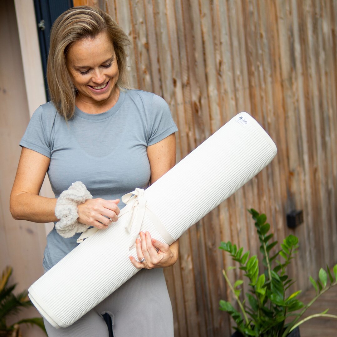 The bottom is lined with anti-slip material, so it holds perfectly on both carpets and hard floors. The surface of the mat is made with the finest Merino sheep wool; it is 1.5 cm thick, making exercising very comfortable. The mat is equipped with two rubber bands for easy storage in a rolled-up condition, and you also get a cotton case with a handle, so you can hang the mat over your shoulder and go to your favorite yoga class :-).