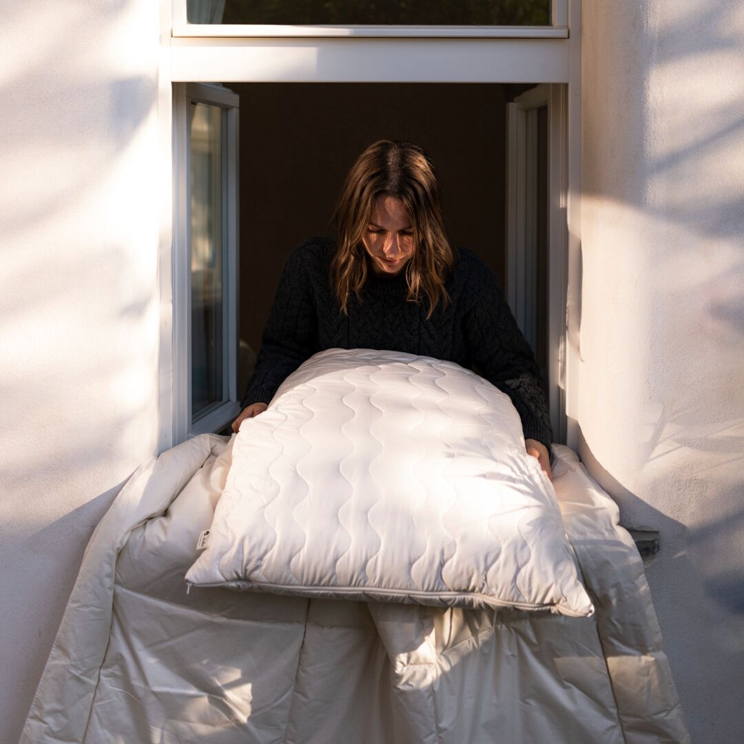 Blankets, duvets, pillows and other bedding made of sheep's wool should be shaken regularly and aired out in the fresh air. That way the material retains its fluffiness and softness, the wool wicks away excess moisture and mite breeding is reduced. Airing out also makes the natural smell of wool disappear faster.
