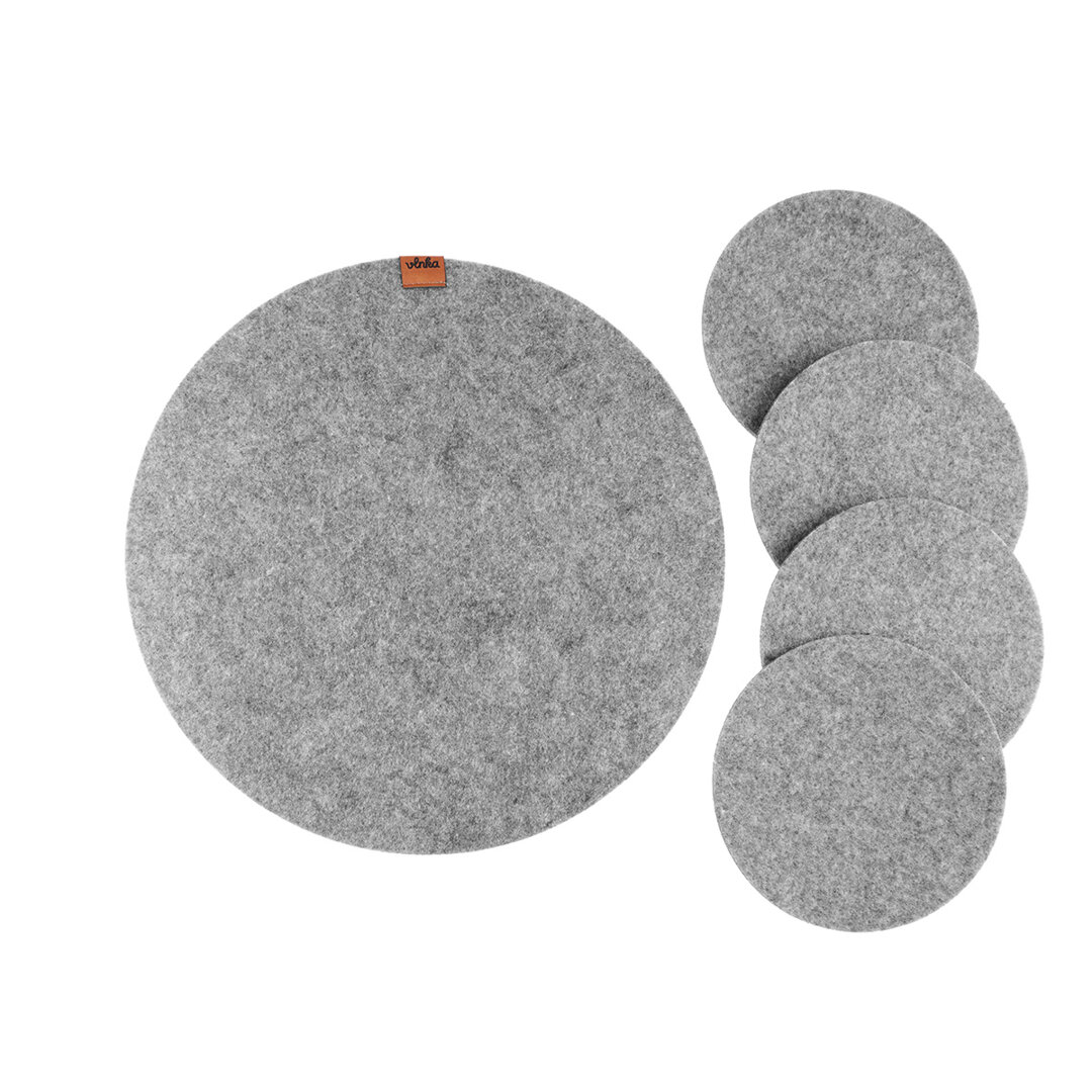The set includes one large coaster and four small ones. It is perfect for serving coffee, tea and chilled drinks. The large coaster can also be used as a table decoration, for example under a vase of flowers.