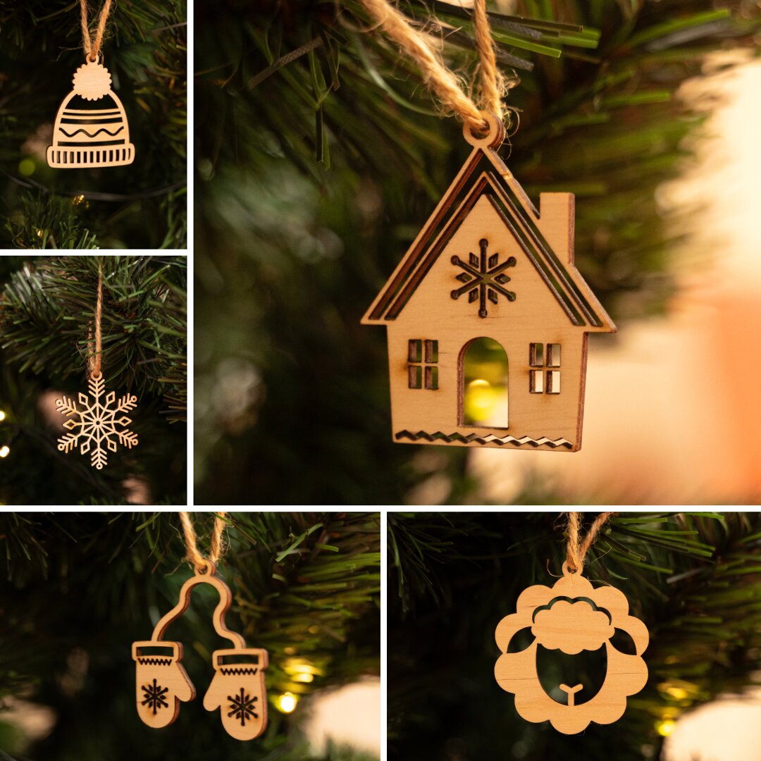 This collection features carefully crafted designs: a snowflake, a bobble hat, mittens, a gingerbread house and, of course, our little sheep. The natural wood tones suit any tree and give it a traditional yet stylish look.
