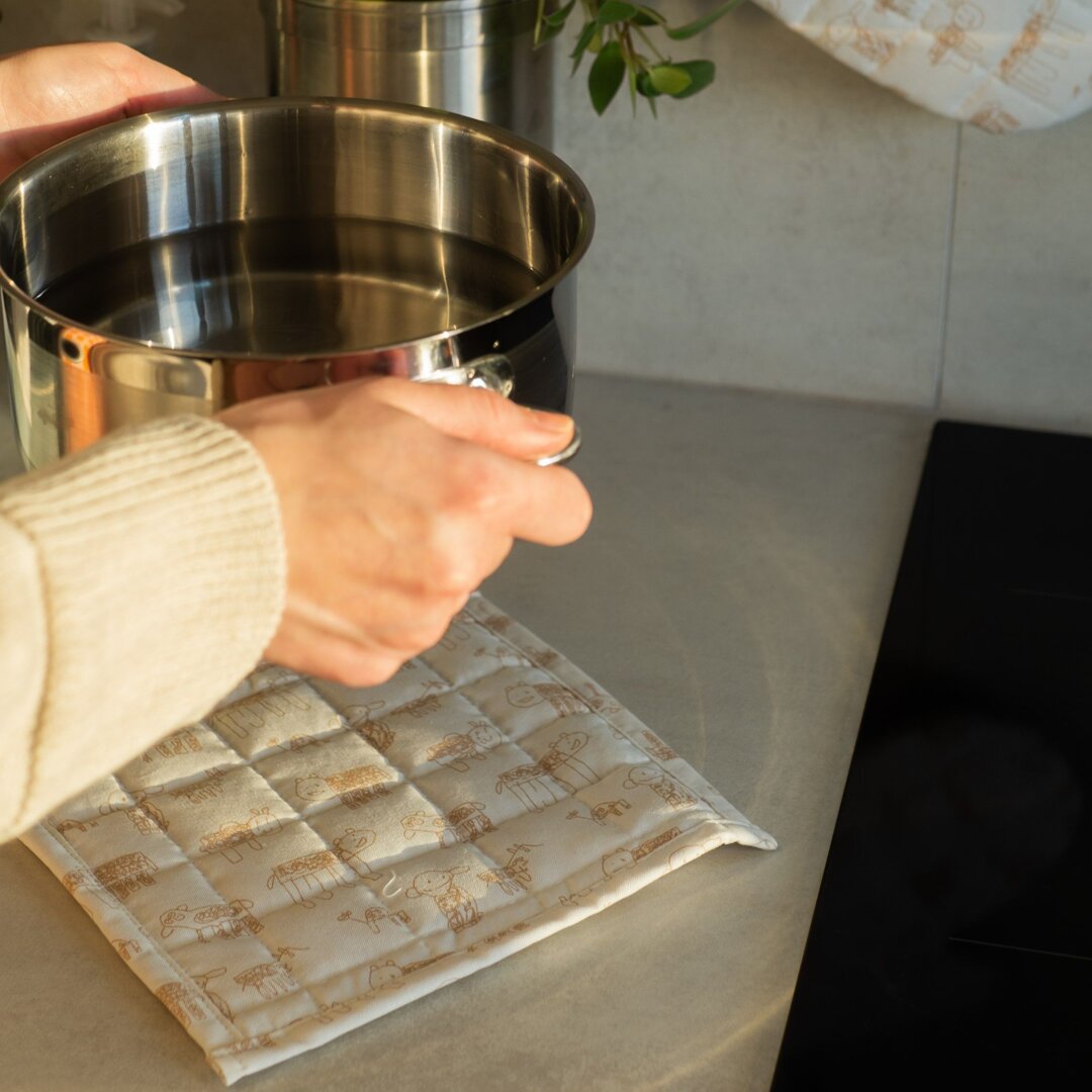 The pad protects the worktop from hot pots and pans and can also be used on the table when serving food. Plus, you can also use it as an oven mitt when removing hot dishes from the oven or microwave. It is easy to care for, just pop in the washing machine with other garments.