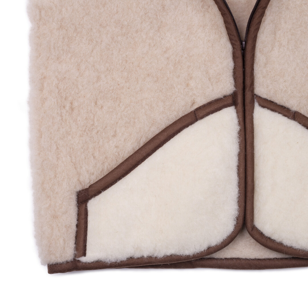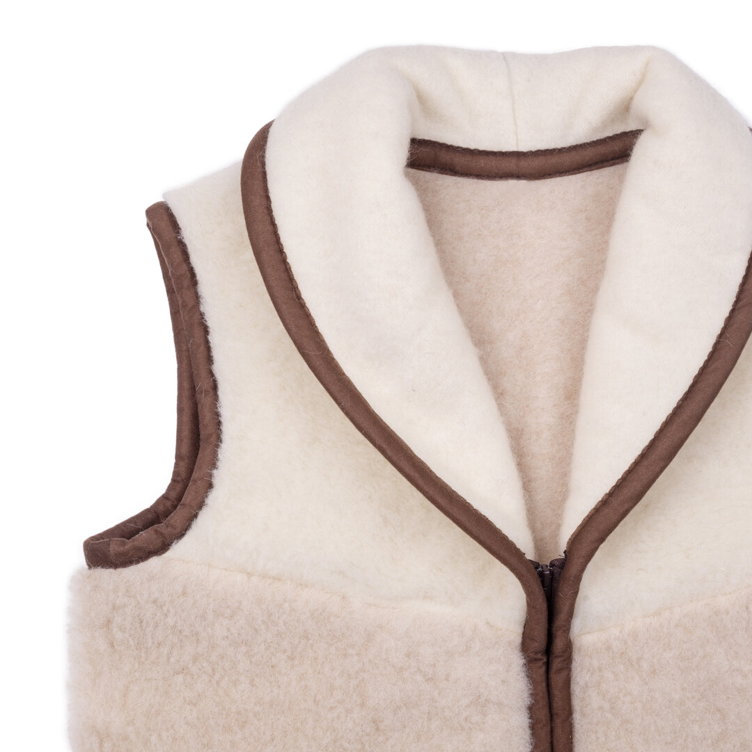 This Vlnka wool vest with a shawl style collar in natural light colour is made of soft 100% Merino wool which means you will never feel cold, even on the most unpleasant and windy winter days. The collar will keep the nape of your neck nice and warm, preventing any problems with stiffness. The neutral cream colour and brown trim give this vest a really stylish, natural look, making it suitable for both men and women. It is also very stylish and thanks to the material, it is great for use in autumn and winter. There are also two handy pockets on the front.