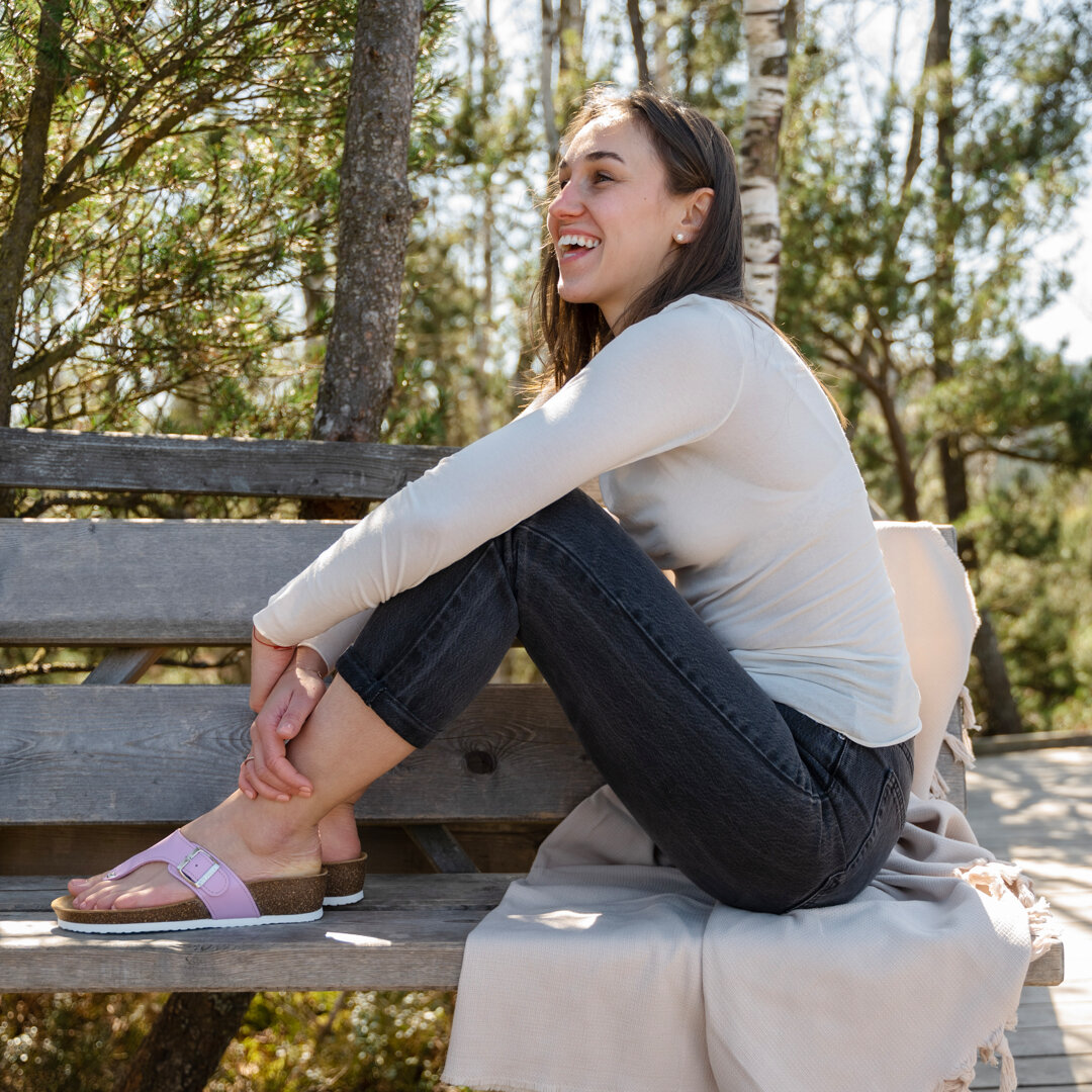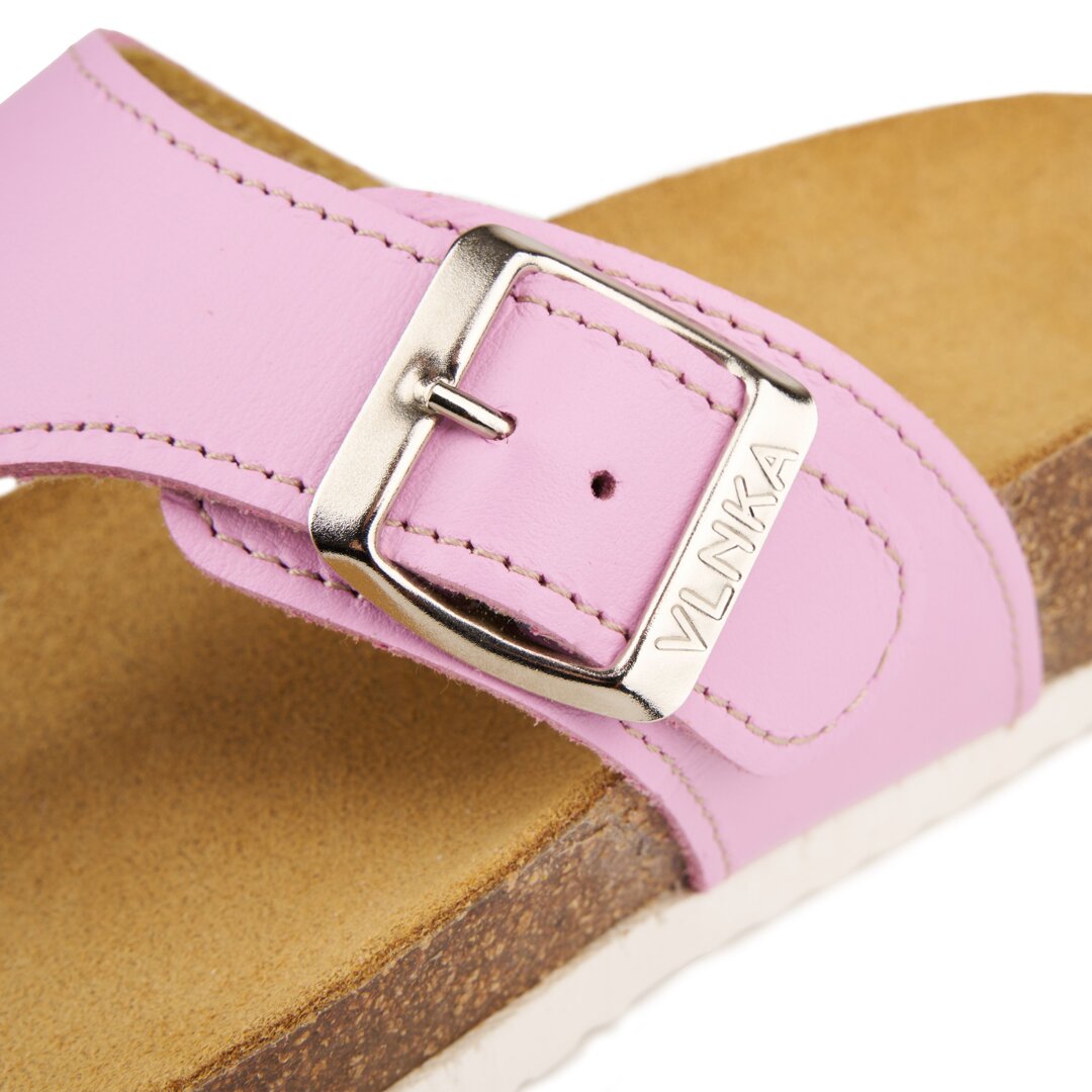 The leather insole has raised edges to keep the foot in the right place in the shoe. The higher edges also provide protection for the feet. Adjust the leather strap over the instep with the metal buckle to the size that suits you. The cork sole cushions the foot well when walking, thus relieving the knees and other parts of the musculoskeletal system.