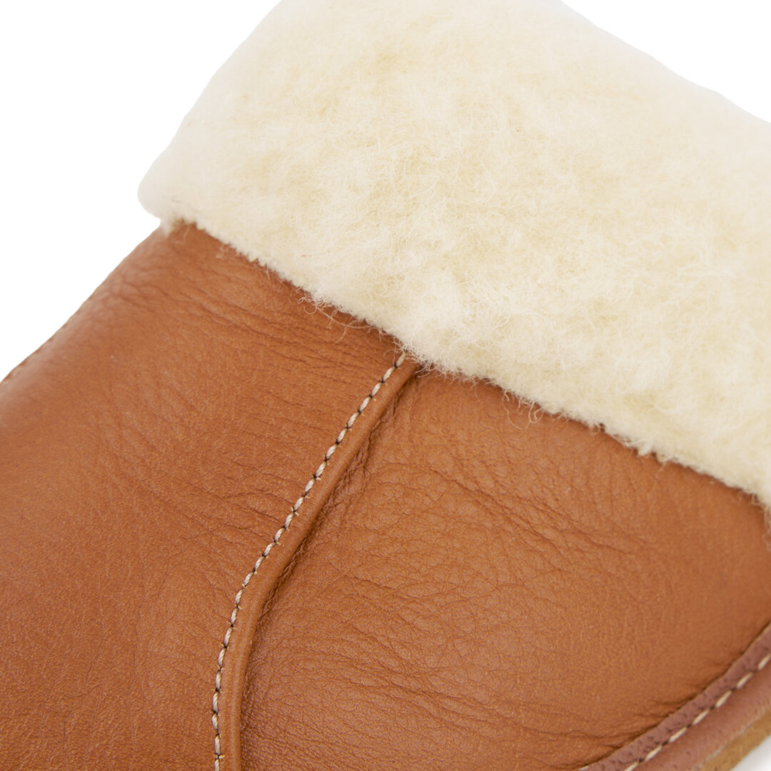 These are beautiful, luxurious slippers lined with soft sheep’s wool that will keep your feet nice and warm on the coldest days and evenings. The outside is made of smooth, durable leather in a natural brown colour. Thanks to the elegant design, these wedge heel slippers can also be used as a change of shoes at your work place in winter. The slightly raised heel helps prevent swelling.