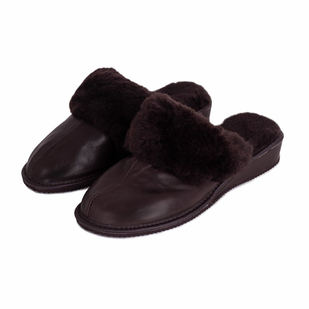 Women's leather wedge slippers with sheep wool Dark brown
