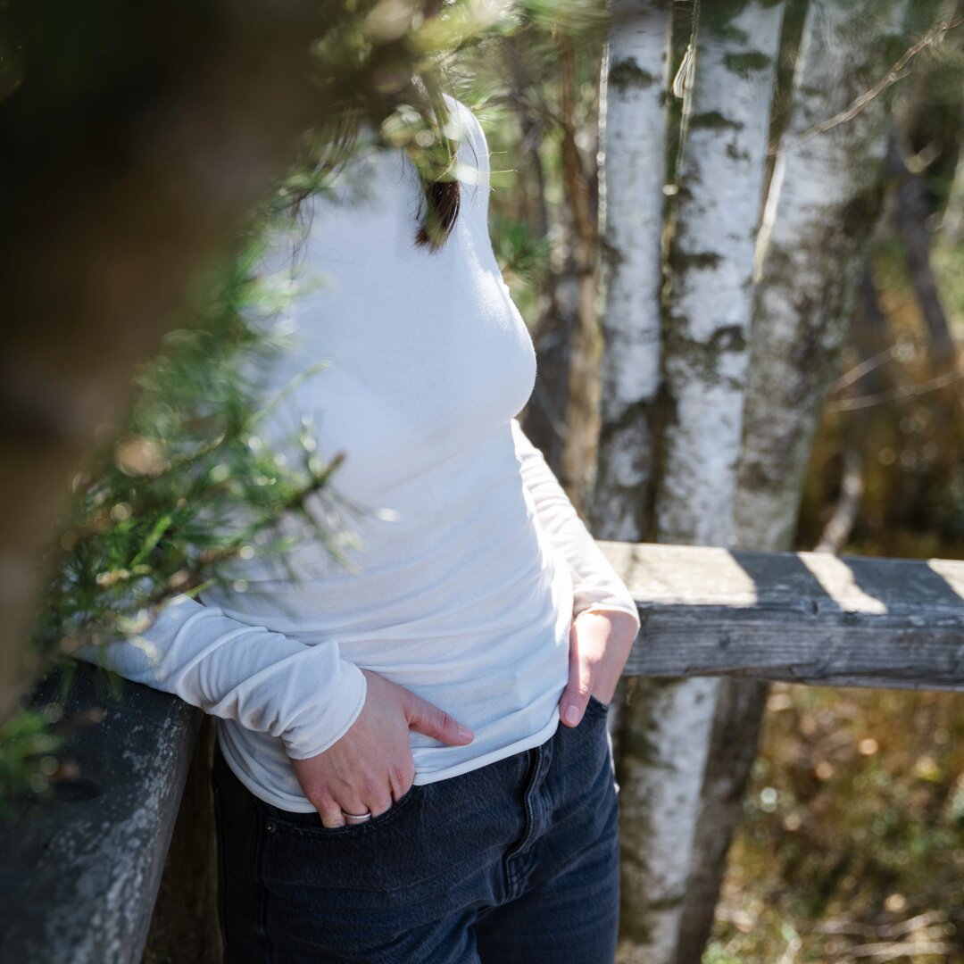 A tight-fitting T-shirt is great as a separate elegant top, but also as a warm undergarment for winter. The natural fibers modal and cashmere combine well with the man-made fibers that give the material durability, flexibility and increase its life.