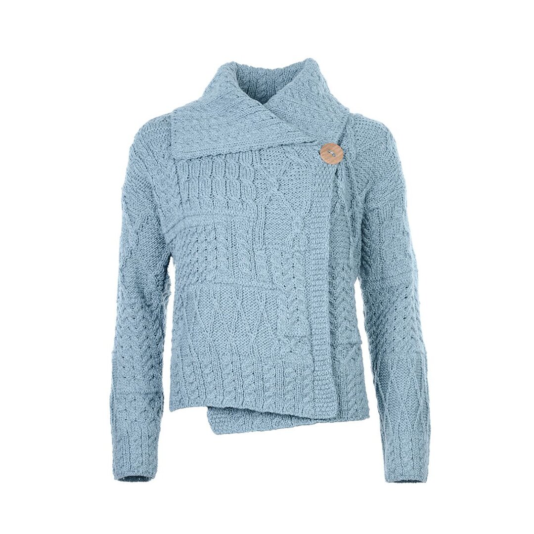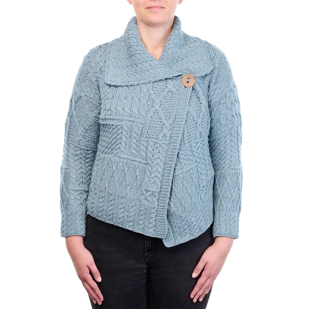 This sweater wraps around you with a button closure, but thanks to the wide collar it falls elegantly and can be worn unbuttoned.