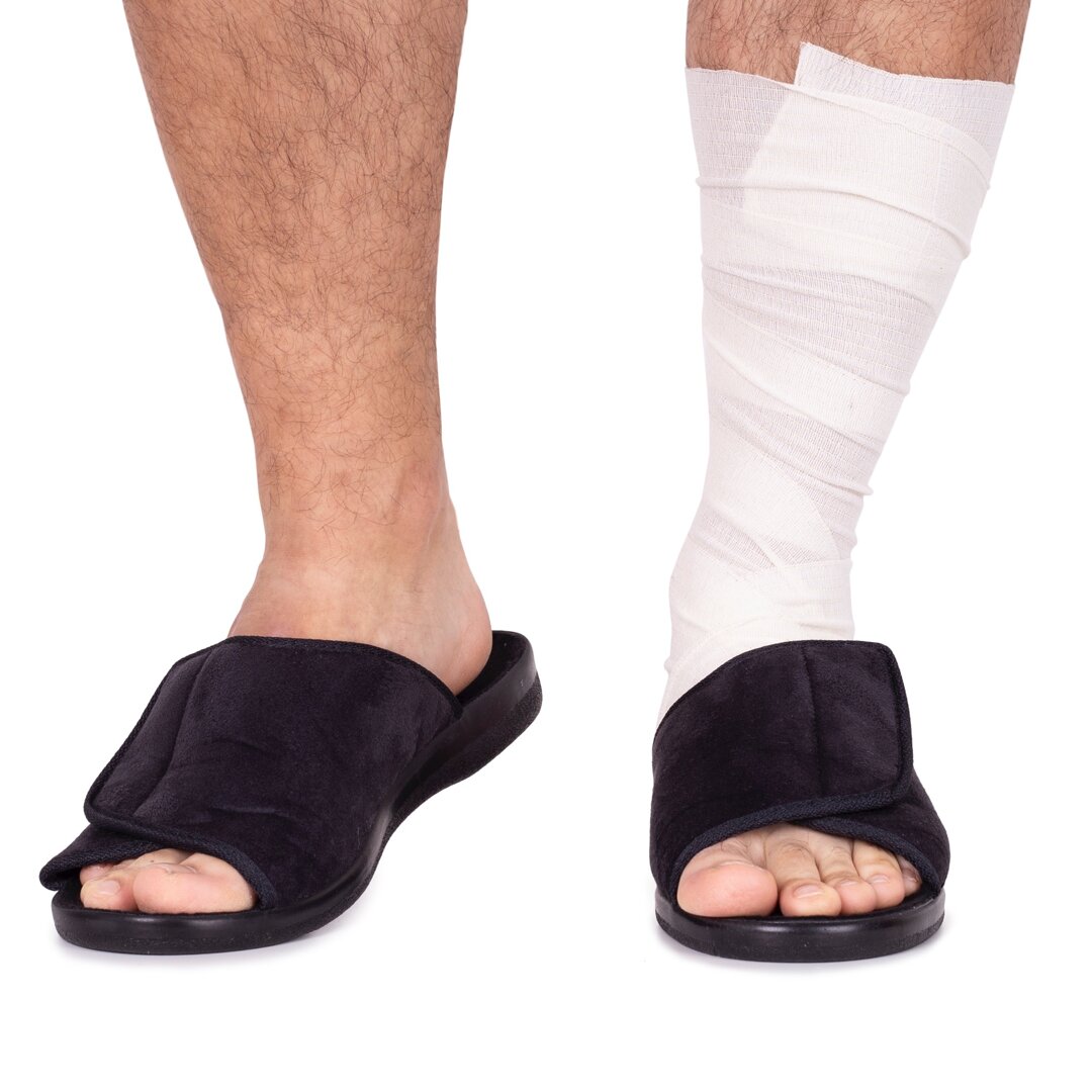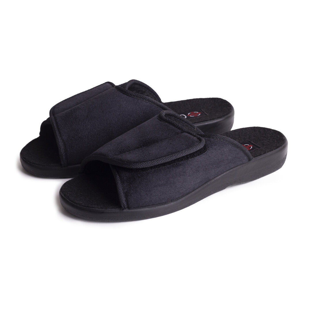 Are you looking for comfortable, light and practical slippers? These soft, open-toe slippers are suitable for anyone who is looking for wide and comfortable shoes to wear at home. Because they are so light and flexible, they will be appreciated by people suffering from various conditions affecting the feet, such as diabetes or arthritis. They are also suitable for feet that have to be bandaged due to an injury or surgery, as the velcro strap allows you to adjust the shoes to fit your feet.