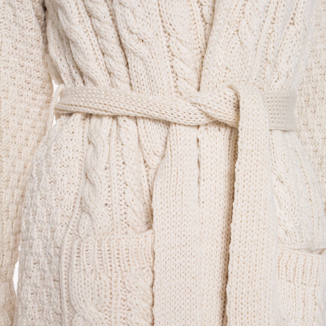 The cardigan wraps around your body, and you can wear it with or without a belt.The fact that it is extra long means your lower back will be protected from the cold and draught. In addition, there are two handy pockets on the front.