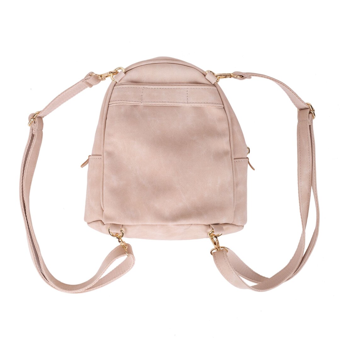 The backpack has a main large zippered pocket and and two smaller pockets hidden inside for keys, money and other important small items. On the front of the backpack there is another small pocket with a fastener and on the back of the backpack there is a practical loop for hanging.