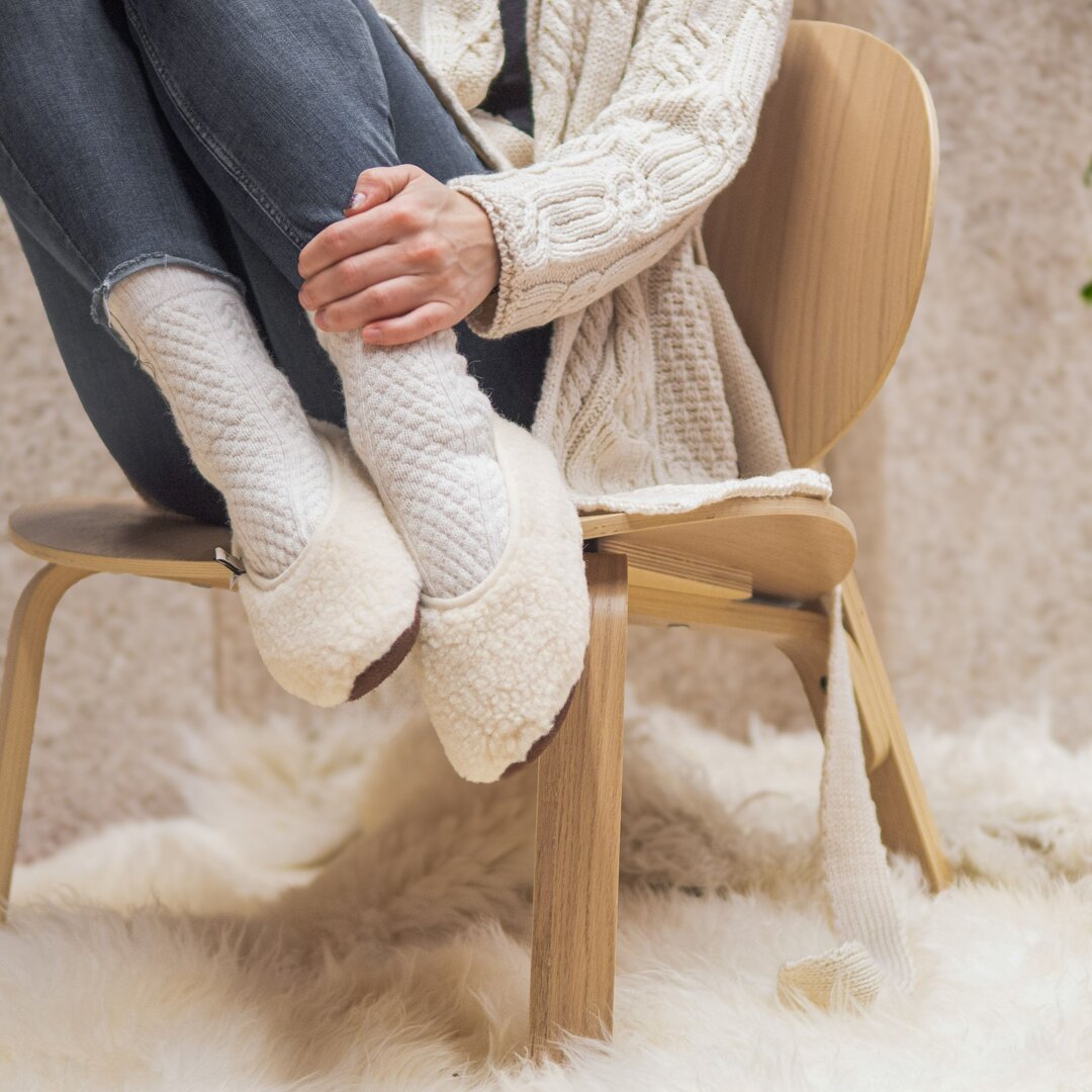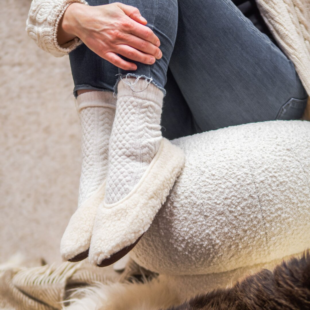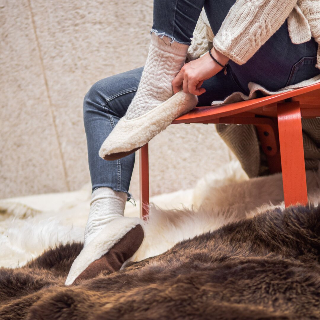 It is important to store your sheep wool or wool-insulated footwear at home in a well-ventilated and dry place between wearing. Thanks to its natural lanolin content, wool is able to clean itself and does not produce odours like other materials. If the footwear gets dirty, you can remove the dirt with a damp cloth. If necessary, you can hand wash the sheep wool slippers and ballerinas in a water bath up to 30°C. Remember to always use a detergent suitable for wool.