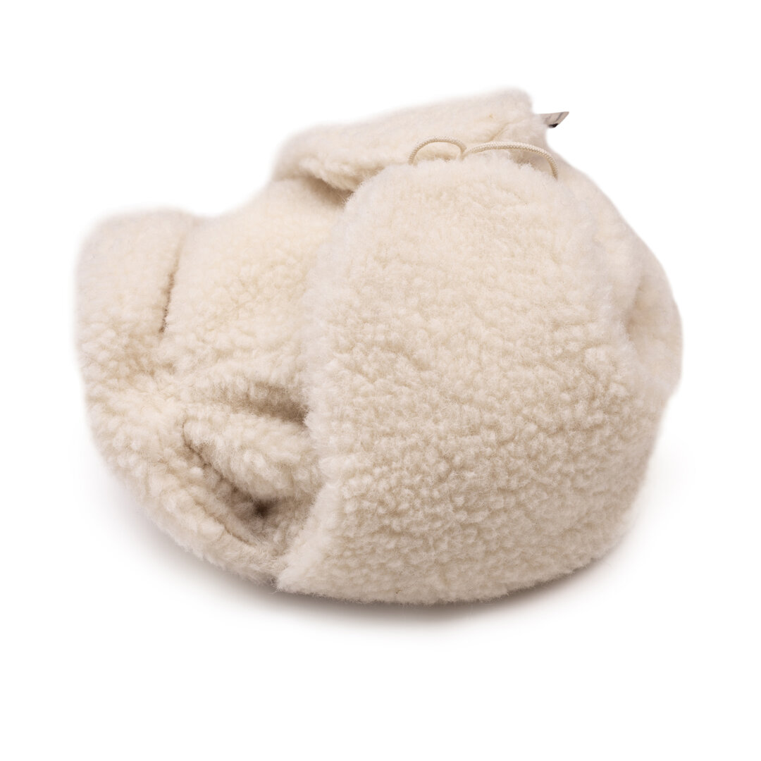 This hat is lined with fleece inside and has pure sheep's wool on the outside. The ear flaps offer great protection in freezing weather, and when it gets warmer, you can just fold them up and tie them together to keep them in place.