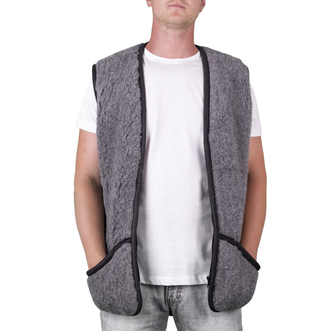 This zip-up wool vest in grey colour design with a black trim is made of soft 100% Merino wool which means you will never feel cold, even on the most unpleasant and windy winter days. The design in neutral grey colour is suitable for both men and women. It is also very stylish and thanks to the material, it is great for use in autumn and winter. There are also two handy pockets on the front.