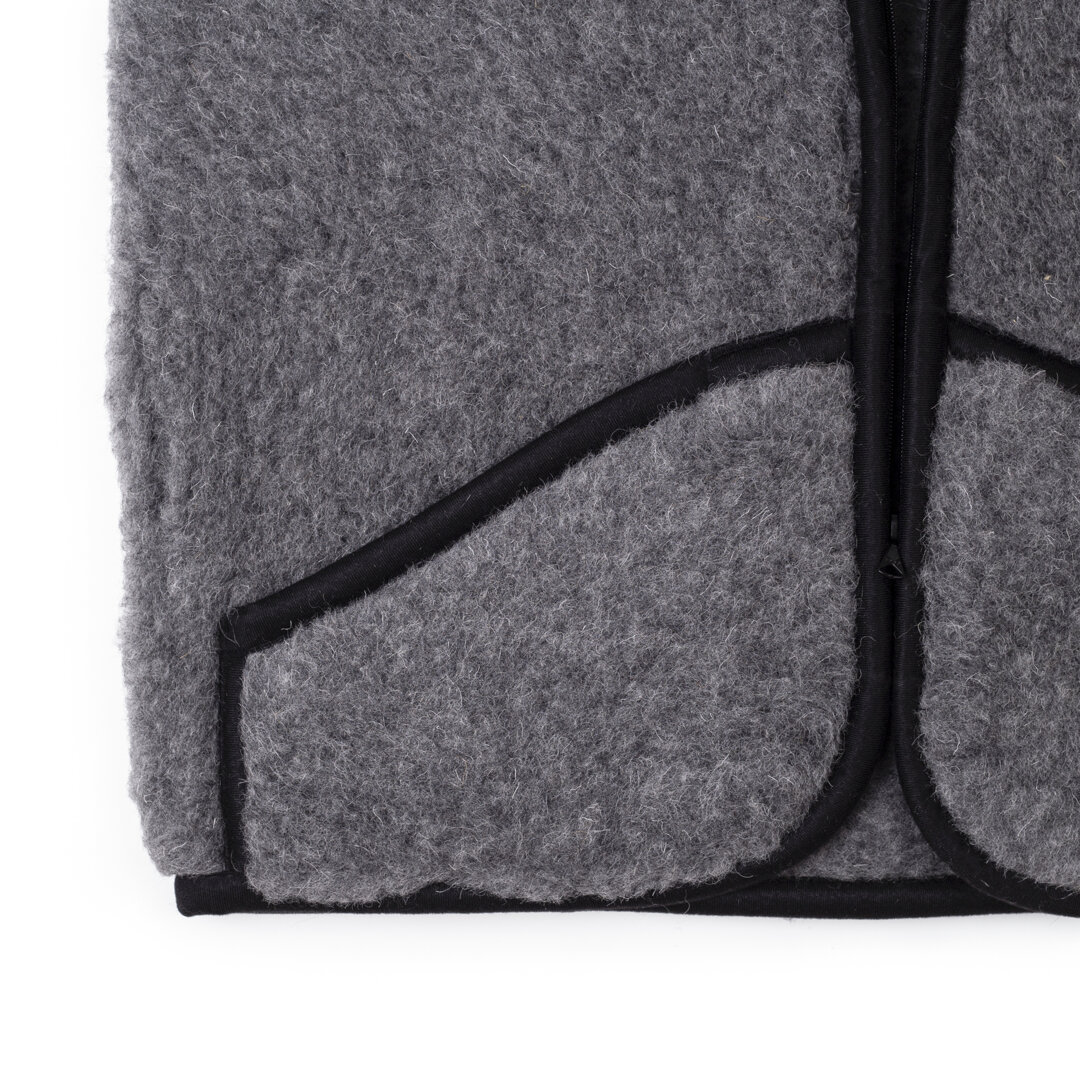 This zip-up wool vest with a shawl style collar in grey colour and black trim is made of soft 100% Merino wool which means you will never feel cold, even on the most unpleasant and windy winter days. The collar will keep the nape of your neck nice and warm, preventing any problems with stiffness. The design in neutral grey colour is suitable for both men and women. It is also very stylish and thanks to the material, it is great for use in autumn and winter. There are also two handy pockets on the front.