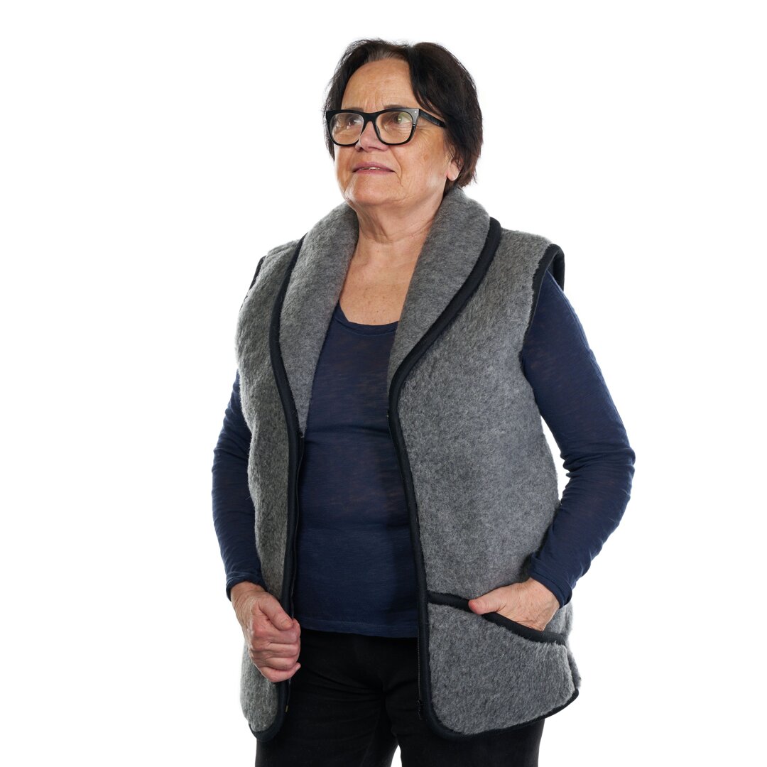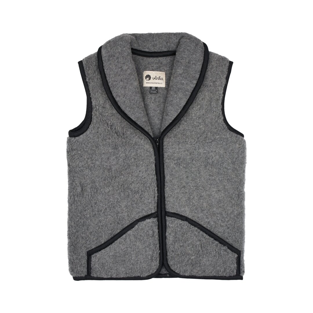 This wool vest with shawl style collar in grey colour with a black trim is made of soft 100% Merino wool which means you will never feel cold, even on the most unpleasant and windy winter days. The collar will keep the nape of your neck nice and warm, preventing any problems with stiffness. The neutral grey colour is suitable for both men and women.