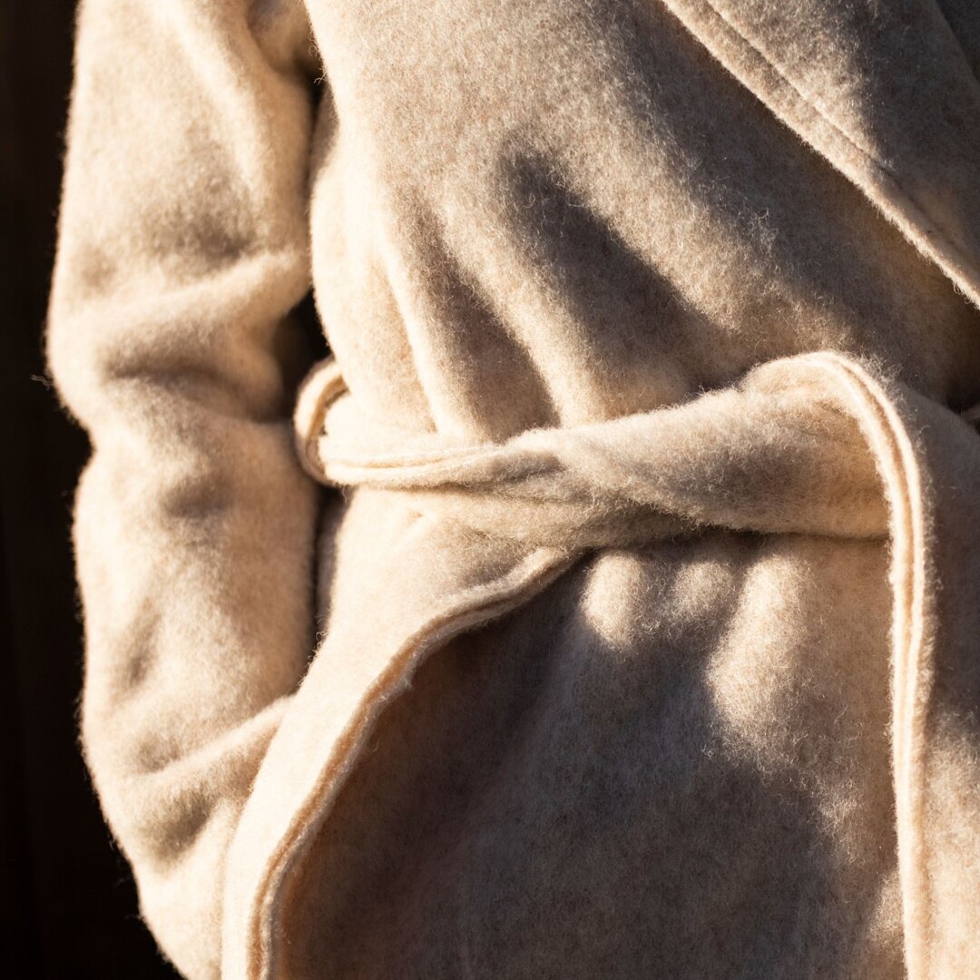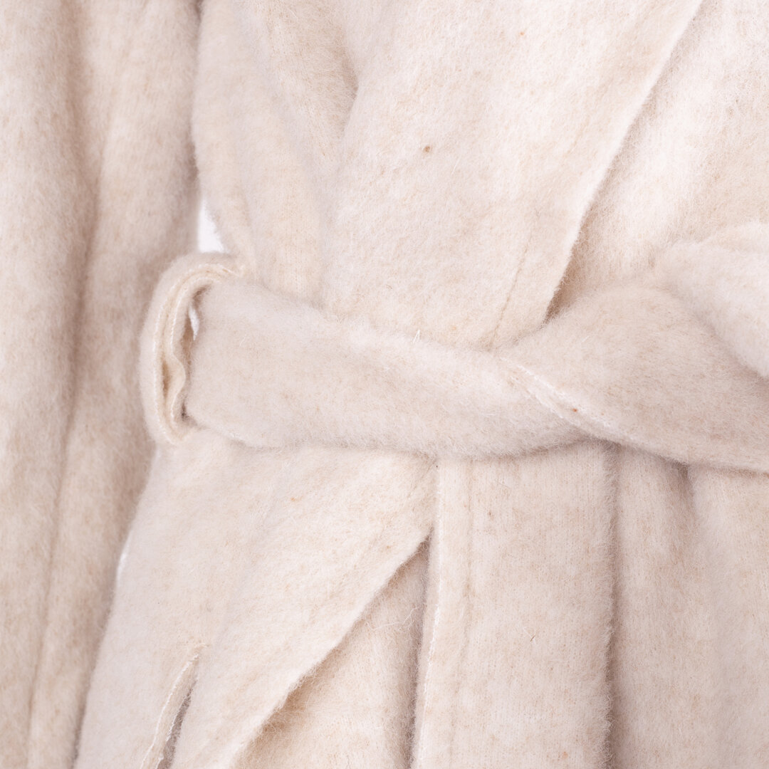 This soft wrap coat is lightweight, yet thanks to the pure wool material it is pleasantly warm. The wool effectively insulates against the cold, which is also helped by the below-the-knee cut. The coat can be worn loose, but if it is cold, you can tie it with a belt. Two large pockets will hide all your essential items and keep your hands warm.
