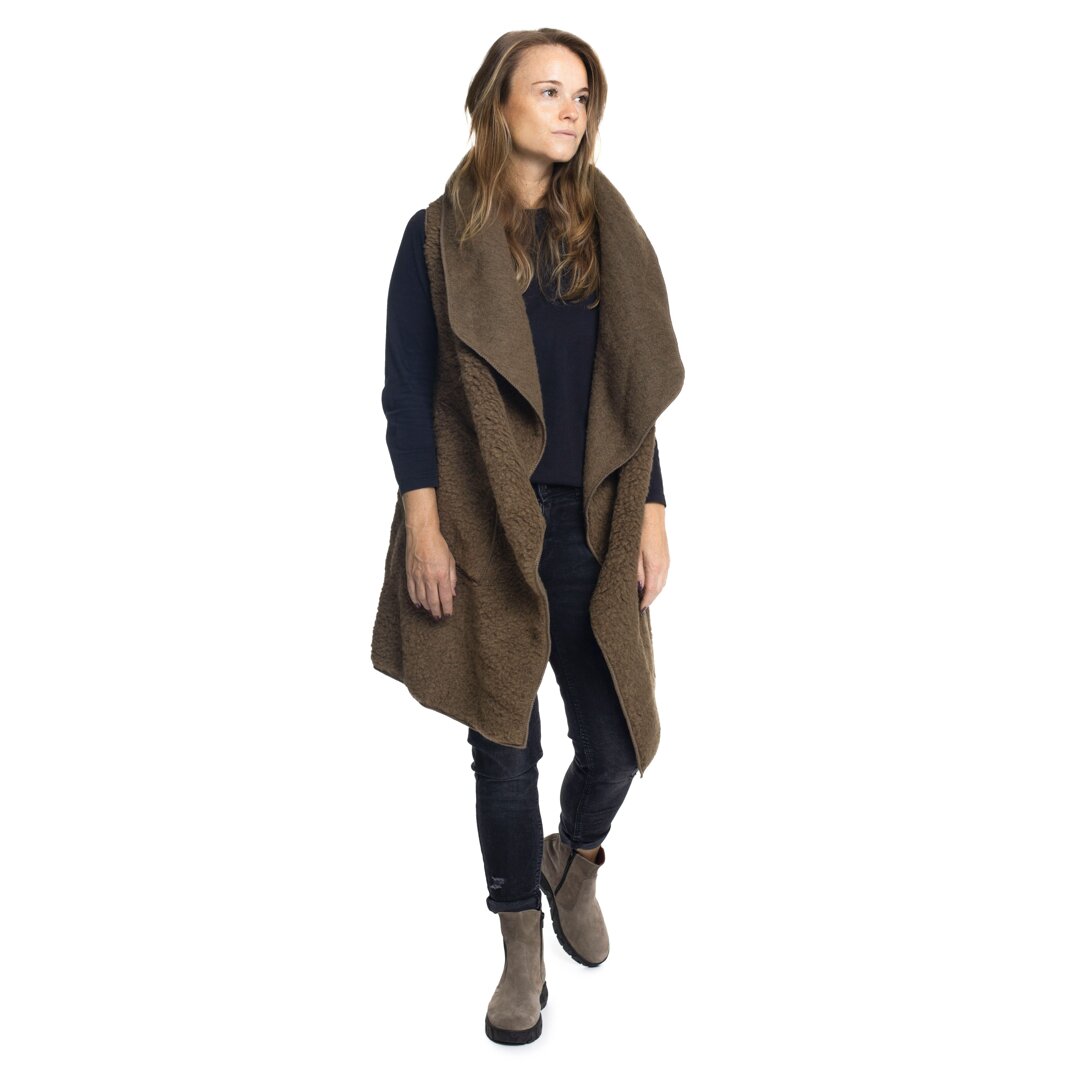 The vest's long cut will help keep your entire back and hip area, which is often susceptible to cold, warm and cozy. The wide collar flows into an elegant loose fitting vest that can be worn open or accessorised with a belt. There are also practical pockets on each side.