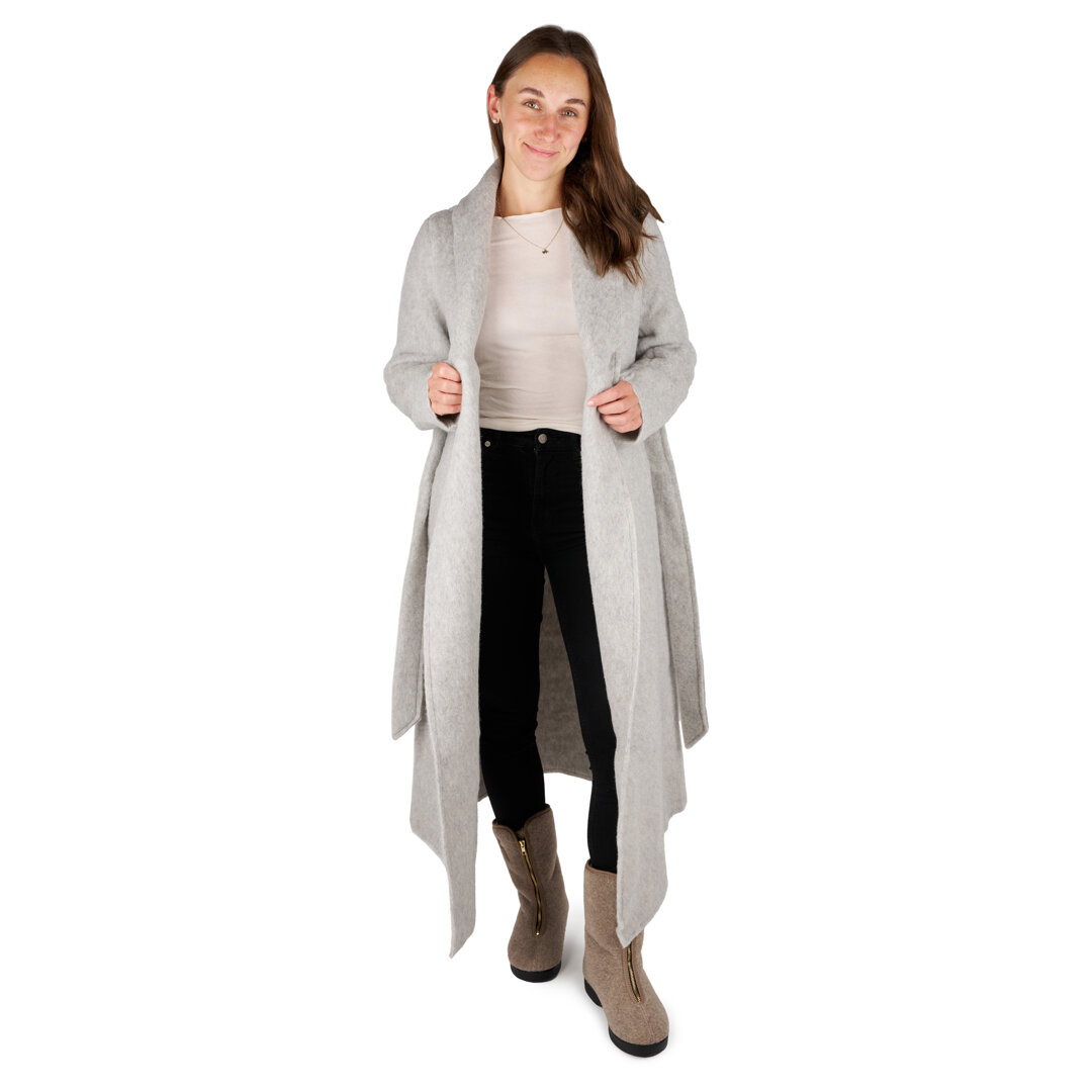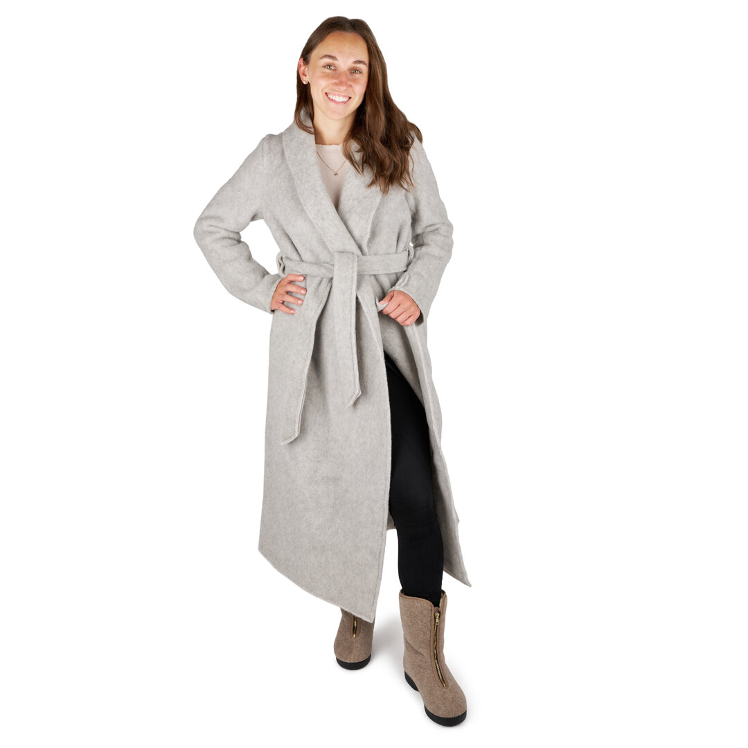 The soft wrap coat is lightweight, yet thanks to the pure wool material, it is pleasantly warm. Wool effectively insulates against the cold, which is also helped by the length of the coat below the knee. You can wear the coat open, but if it's cold, you can tie it with a belt. Two large pockets will hide all your important items and warm your cold hands.